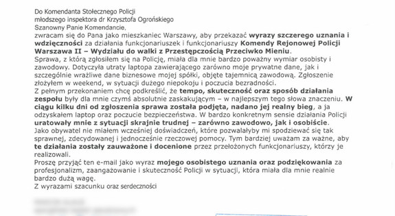 Na ręce Komendanta Stołecznego Policji wpłynęły podziękowania skierowane do funkcjonariuszy Wydziału do walki z Przestępczością Przeciwko Mieniu Komendy Rejonowej Policji Warszawa II za profesjonalne i skuteczne przeprowadzenie czynności w sprawie kradzieży laptopa.