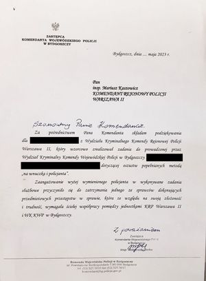 Policjant z Wydziału Kryminalnego, Komendy Rejonowej Policji Warszawa Mokotów otrzymał podziękowania od Zastępcy Komendanta Komendy Wojewódzkiej Policji w Bydgoszczy. Pochwalne pismo wpłynęło na ręce Komendanta Rejonowego Policji Warszawa II. Policjant wzorowo zrealizował zadania w prowadzonej sprawie dotyczącej oszustw popełnianych metodą „na wnuczka i policjanta”.