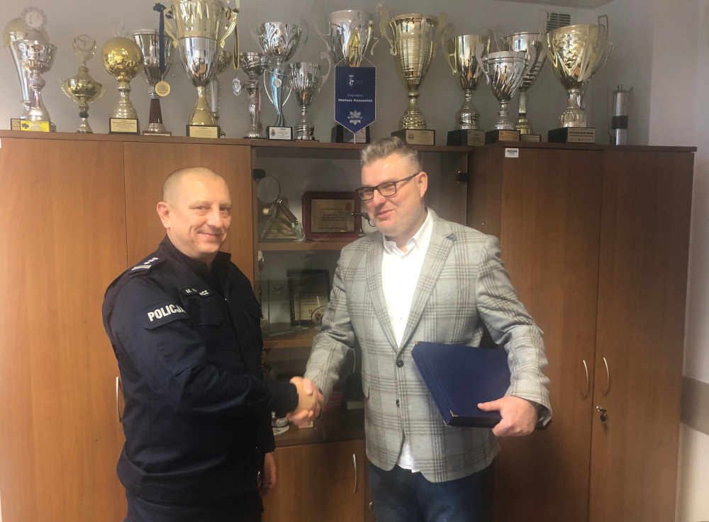 W uznaniu za wkład w bezpieczeństwo mieszkańców, insp. Mariusz Kaszowicz osobiście wręczył firmową tablicę z wygrawerowanymi podziękowaniami Panu Dariuszowi Bielskiemu. To symboliczne wyróżnienie ma na celu podkreślenie znaczenia współpracy między służbą a profesjonalistami z zewnątrz.