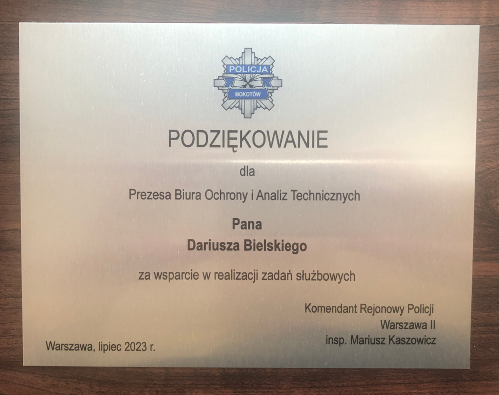 Komendant Rejonowy Policji Warszawa II insp. Mariusz Kaszowicz, wyraził podziękowania dla Prezesa Biura Ochrony i Analiz Technicznych Pana Dariusza Bielskiego, za wartościową pomoc, współpracę i wsparcie w działaniach wykonawczych Policji. W uznaniu dla zaangażowania i wkładu w poprawę bezpieczeństwa mieszkańców, Komendant uhonorował zaproszonego gościa specjalnie wykonaną tablicą z podziękowaniami.
