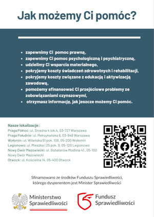 Ministerstwo Sprawiedliwości udostępniło stronę poświęconą osobom pokrzywdzonym przestępstwem (pod adresem: www.funduszsprawiedliwosci.gov.plotwiera się w nowym oknie otwiera się w nowym oknie), na której znajdują się informacje o prawach osób pokrzywdzonych przestępstwem, „Informator dla pokrzywdzonego” oraz baza danych o instytucjach i organizacjach pozarządowych udzielających ofiarom przestępstw wsparcia psychologicznego i informacji prawnej, z podziałem na województwa.