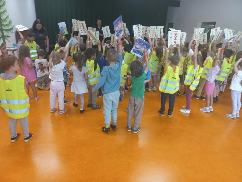 Funkcjonariusz poruszył również kwestie elementów odblaskowych na odzieży wierzchniej. Przypomniał, że powinno się je nosić podczas spacerów po zmroku poza terenem zabudowanym, ale także w terenie zabudowanym, ponieważ wówczas kierowca widzi taką osobą z większej odległości i jest w stanie odpowiednio wcześnie podjąć odpowiedni manewr, żeby bezpiecznie ominąć pieszego. Spotkanie zakończyło się pytaniami i spostrzeżeniami najmłodszych na tematy bezpieczeństwa.