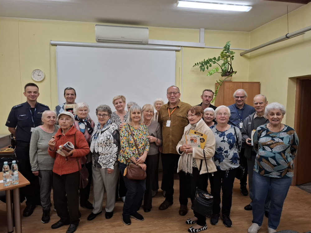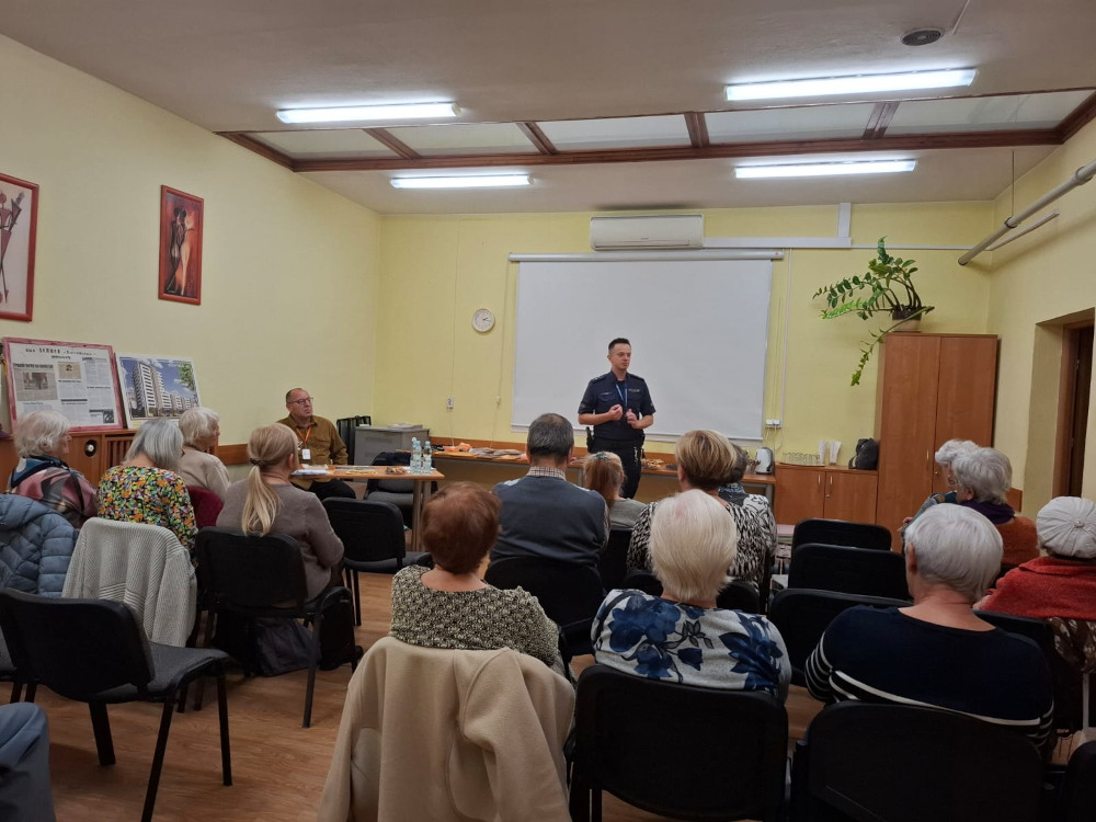 Podczas spotkania seniorzy mieli okazję wysłuchać prelekcji na temat zagrożeń, z jakimi mogą się spotkać na co dzień. Policjant omówił różne formy przestępczości, w tym szczególnie te skierowane przeciwko osobom starszym – m.in. oszustwa „na wnuczka”, „na policjanta” czy telefoniczne. Uczestnicy dowiedzieli się również, jak unikać niebezpiecznych sytuacji oraz jakie działania mogą podjąć, aby zmniejszyć ryzyko stania się ofiarą przestępstwa. Każdy z obecnych otrzymał ulotkę zawierającą numery telefonów alarmowych oraz praktyczne porady dotyczące reagowania w przypadku zagrożenia.