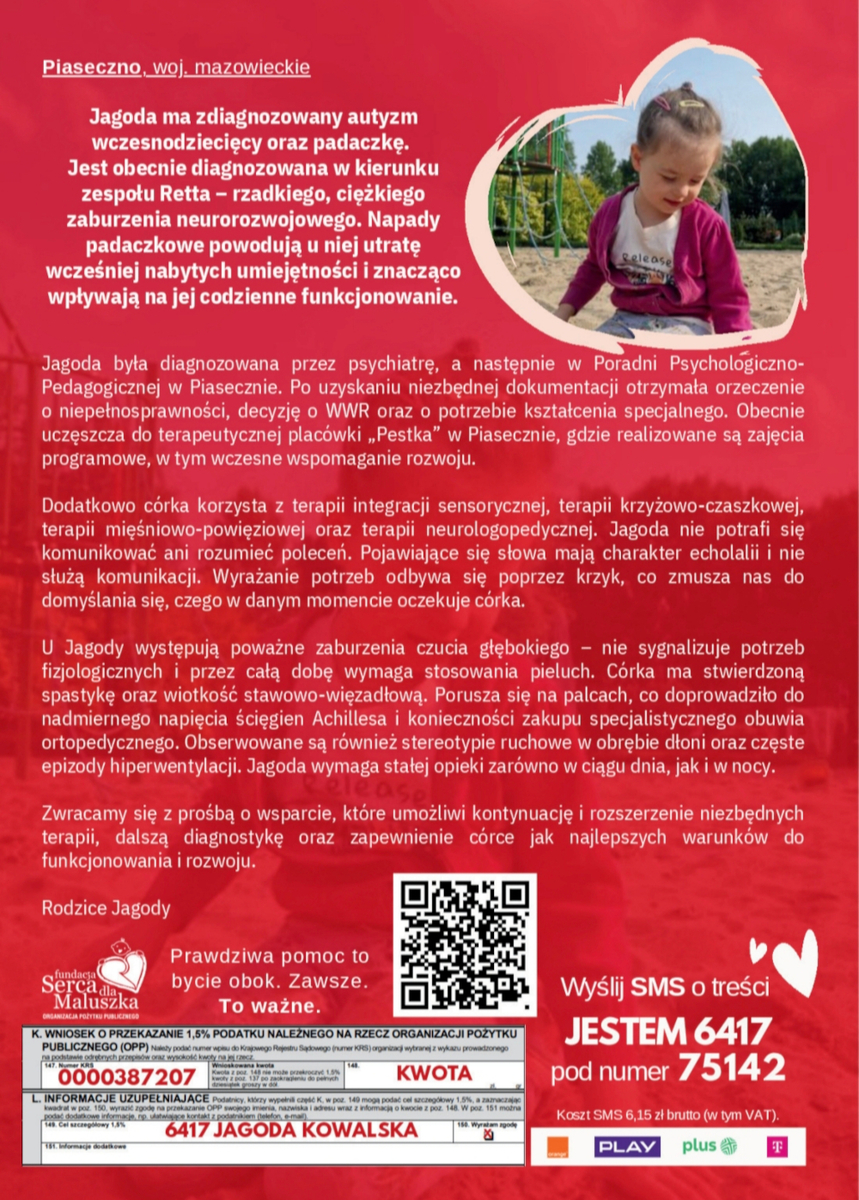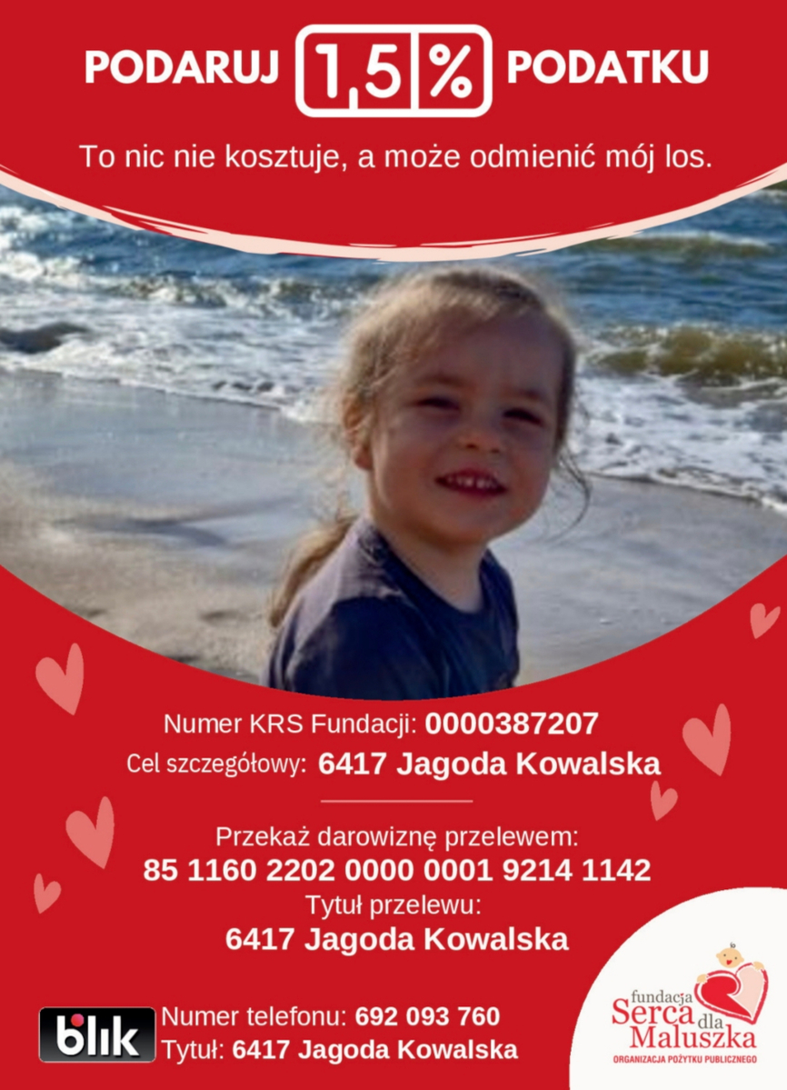 Rodzice Jagody zwracają się z prośbą o pomoc, która umożliwi kontynuację i rozszerzenie niezbędnych terapii, dalszą diagnostykę oraz zapewnienie dziewczynce jak najlepszych warunków do funkcjonowania i rozwoju.