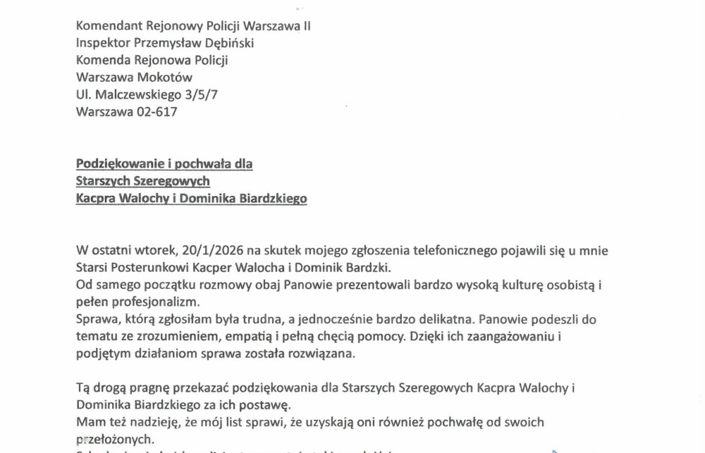 Jak wynika z treści korespondencji, we wtorek 20 stycznia 2026 roku, w związku ze zgłoszeniem telefonicznym, interwencję podjęli st. post. Kacper Walocha oraz st. post. Dominik Biardzki. Od samego początku rozmowy policjanci wykazali się wysoką kulturą osobistą, empatią oraz pełnym profesjonalizmem. Sprawa, choć trudna i wymagająca szczególnej delikatności, została przez funkcjonariuszy potraktowana z należytą uwagą i zaangażowaniem, a dzięki podjętym działaniom zakończyła się pomyślnie.