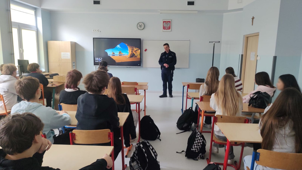 Spotkanie poprowadził młodszy aspirant Łukasz Urbanek. Podczas prelekcji omówił z uczniami zagadnienia związane z przemocą fizyczną i słowną, a także zjawisko cyberprzemocy, które coraz częściej dotyka młodych ludzi. Funkcjonariusz wyjaśnił, czym jest przemoc rówieśnicza, jakie formy może przyjmować – od bezpośredniej agresji po publikowanie obraźliwych treści w Internecie – oraz jakie konsekwencje może nieść dla osób pokrzywdzonych.