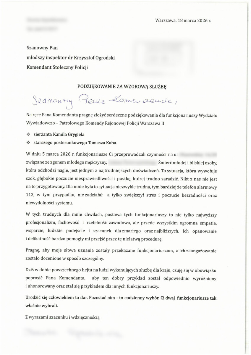 Na ręce Komendanta Stołecznego Policji mł. insp. dr Krzysztofa Ogrońskiego wpłynęły podziękowania skierowane do funkcjonariuszy Wydziału Wywiadowczo-Patrolowego Komendy Rejonowej Policji Warszawa II – sierż. Kamila Grygiela oraz st. post. Tomasza Kuby, którzy wykazali się niezwykłą rzetelnością i empatią podczas jednej z interwencji.