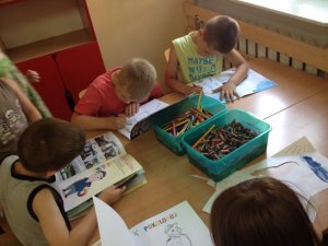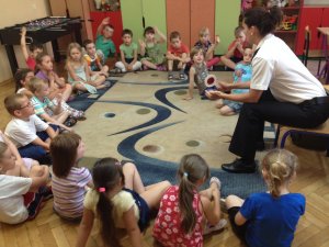 Policjantka przypomniała dzieciom, jak należy zachowywać się w trakcie wakacyjnych wyjazdów, a zwłaszcza o czym należy pamiętać spędzając czas nad wodą. W trakcie spotkania wykorzystano materiały edukacyjne : „Ucz się, baw i bądź bezpieczny z Kapitanem Wyderką” Dzięki kolorowance, poprzez zabawę dzieci uczyły się bezpiecznych zachowań.