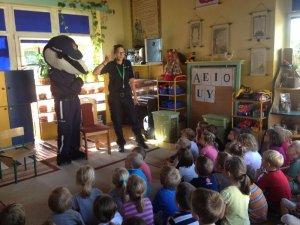 Do niektórych z przedszkoli sierż.szt. Marta Bejer i asp.szt. Katarzyna Świątek zabrały ze sobą gościa specjalnego – Borsuka, maskotkę Komendy Stołecznej Policji. Borsuk i policjantki chętnie opowiadały dzieciom o zawodzie policjanta, pokazywali również wyposażenie policjanta do codziennej służby. Takie spotkania odbyły się również w trzech szkołach podstawowym mieszczących się na terenie naszych dzielnic.