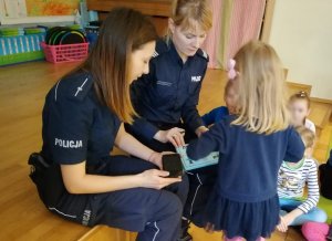 Dzieci mogły też przymierzyć policyjne czapki i zobaczyć, co nosi przy sobie policjant, żeby mógł wykonywać swoje zadania, czyli kajdanki, palkę służbową, latarkę oraz gwizdek, który spodobał się najbardziej.