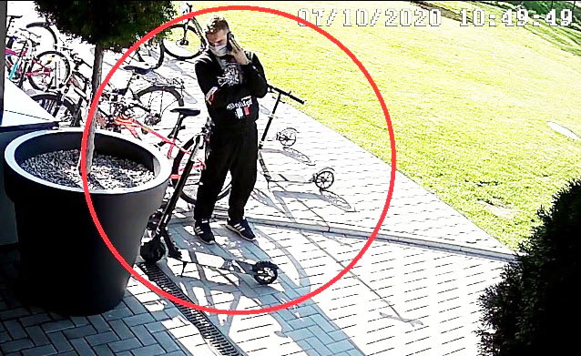 Podejrzanym w tej sprawie jest mężczyzna opublikowany na zdjęciach. W dniu przestępstwa ubrany był w czarną bluzę z kapturem ze wzorami, czarne spodnie dresowe oraz czarne buty z trzema białymi paskami. Hulajnogę zabrał z terenu szkoły przy ul. Hlonda na warszawskim Wilanowie.
