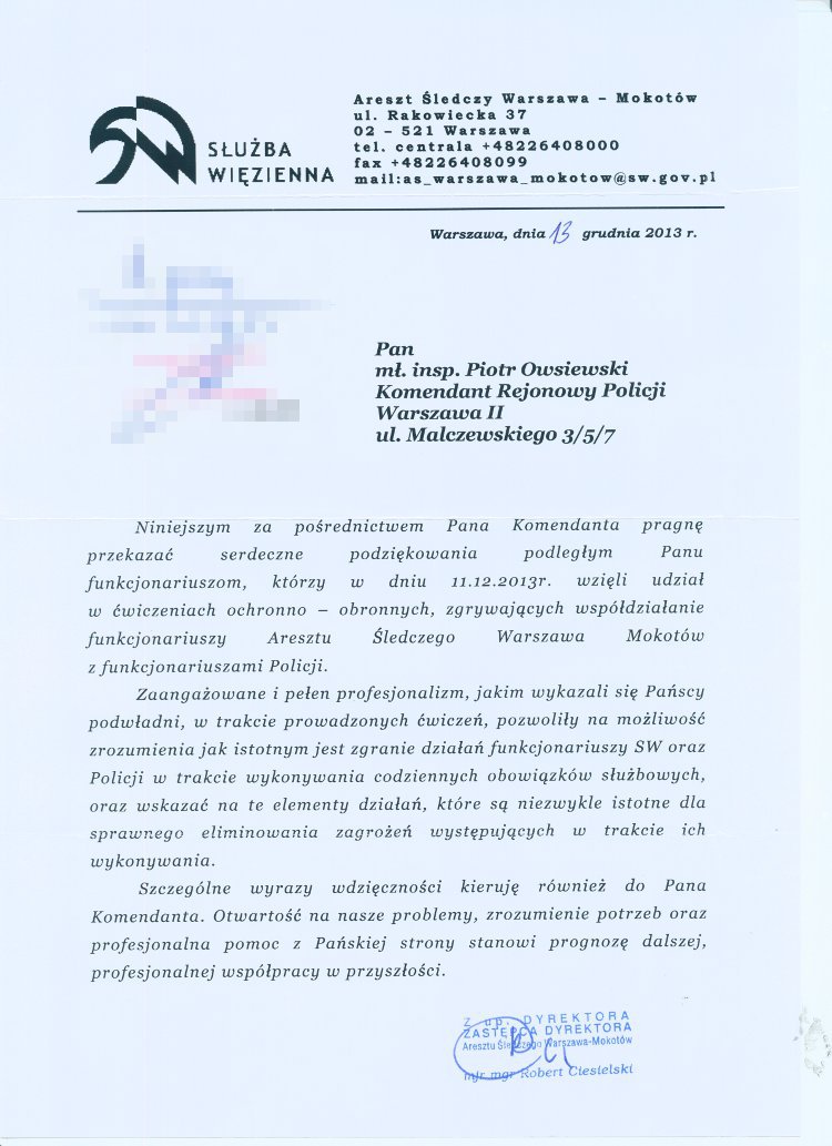 Podziękowanie od Dyrektora Aresztu Śledczego Warszawa-Mokotów Data publikacji 17.12.2013 Powrót Drukuj