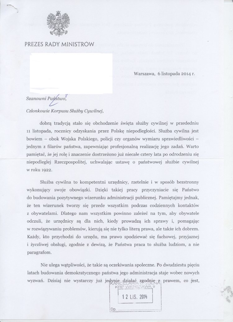 Życzenia dla pracowników cywilnych od Prezesa Rady Ministrów Data publikacji 14.11.2014 Powrót Drukuj