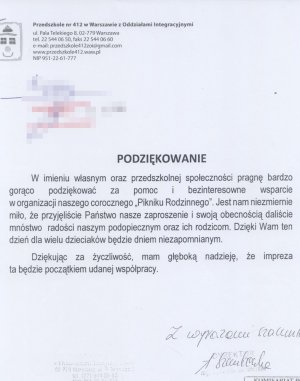 Podziękowanie za udział w „Pikniku Rodzinnym”